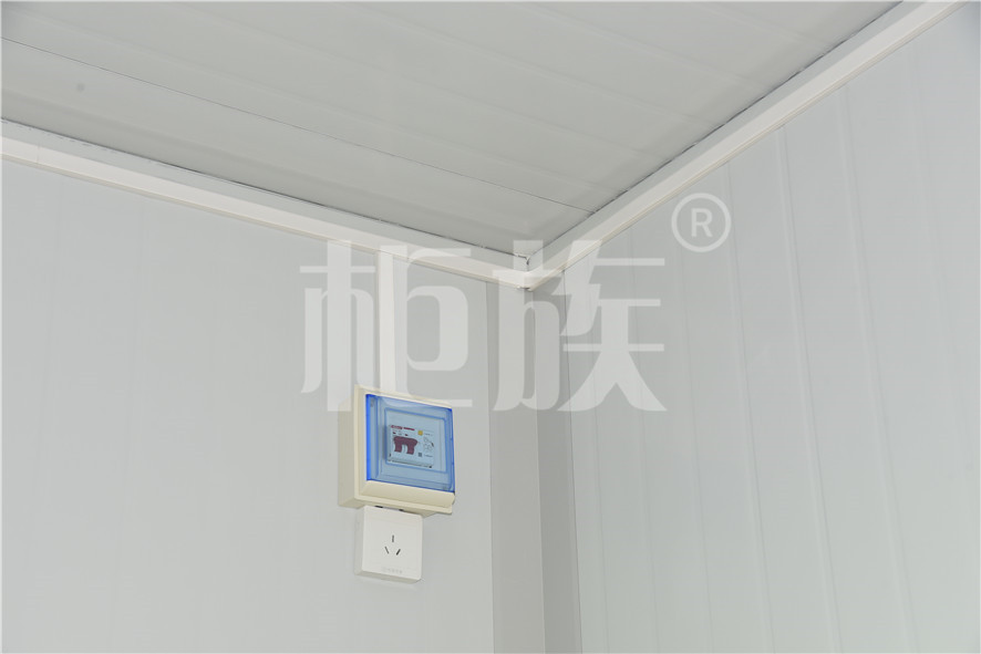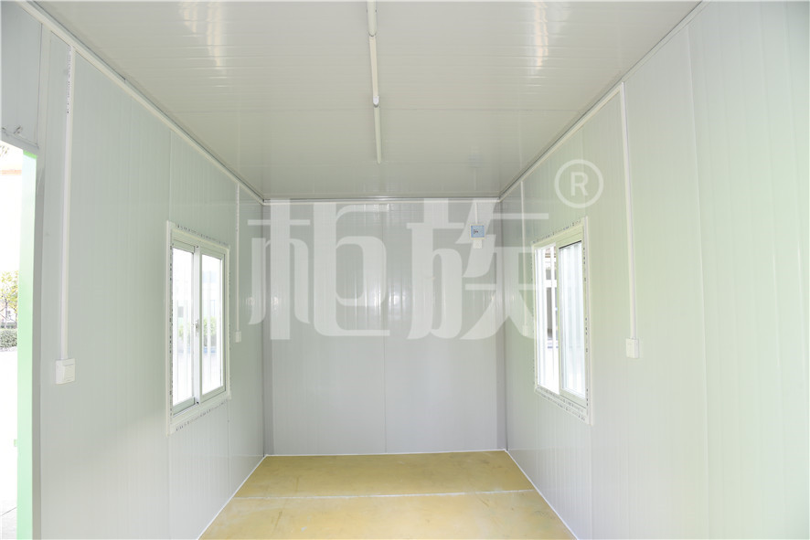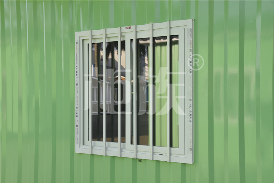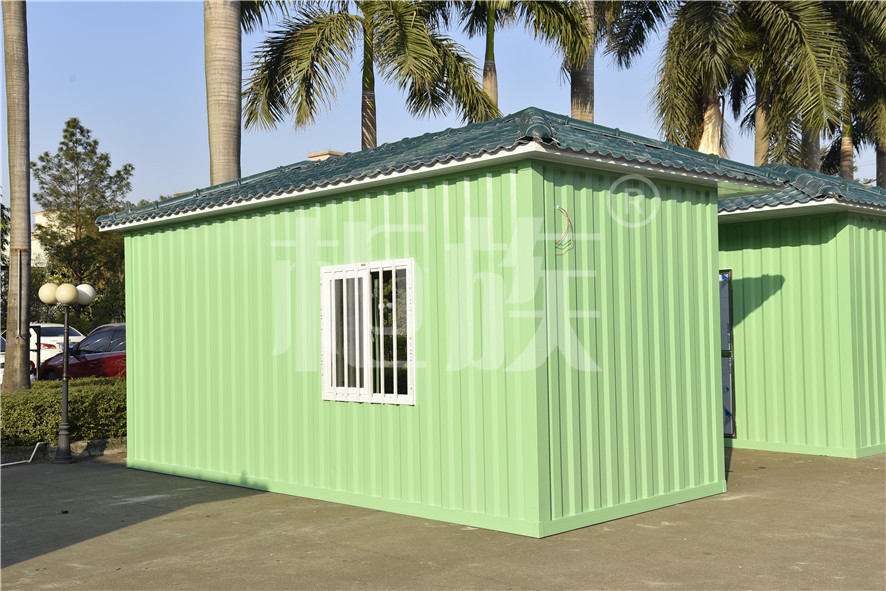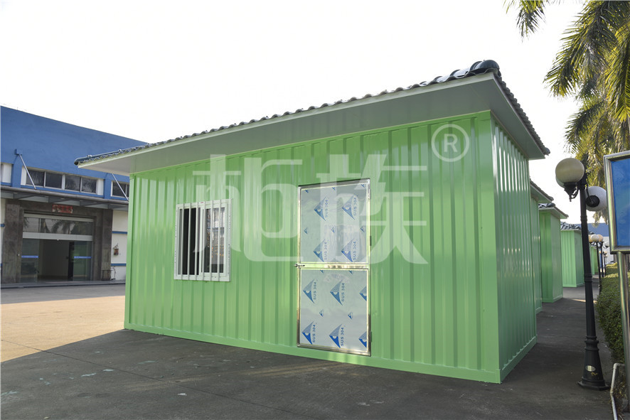 Materials: galvanized rectagular steel tube frame, A-class fireproof corrugated wallboard, aluminum alloy window, stainless steel door, fireproof floor, resin tile roof.