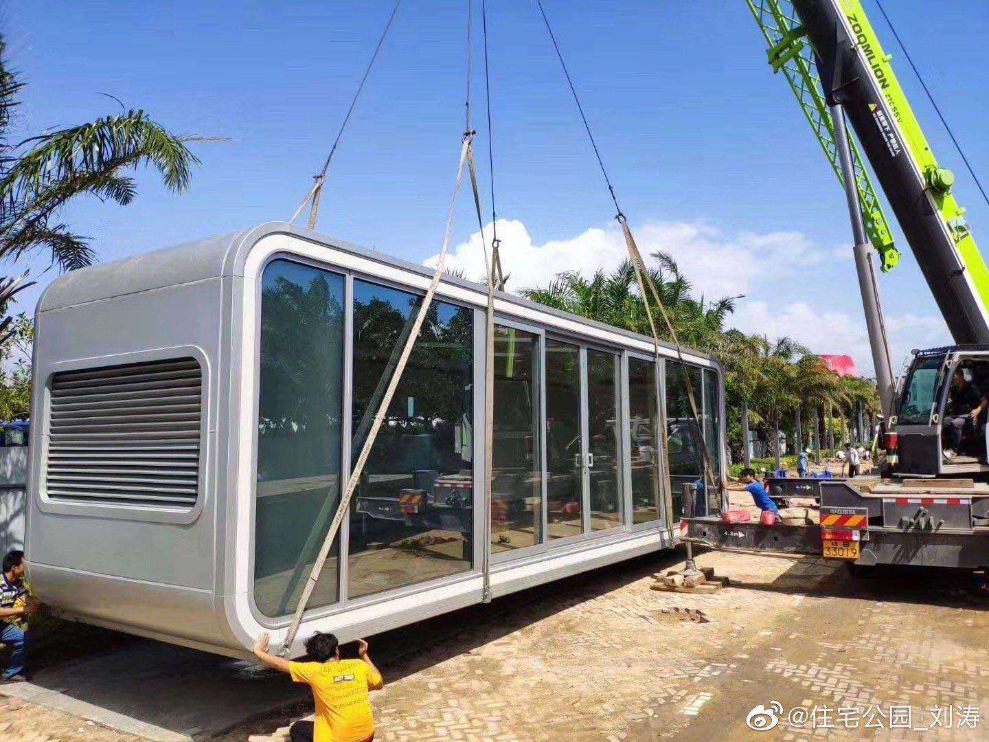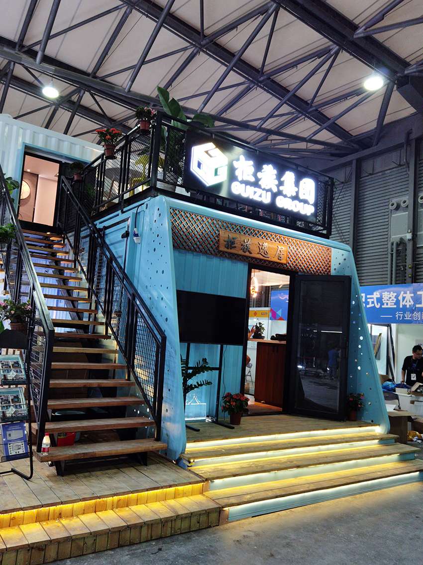 柜族本次參展的產(chǎn)品——逸海小筑位于E2裝配式建筑展區(qū)的2269展位,是一款以藍(lán)白為主色調(diào)、融入了水與波浪元素的海洋風(fēng)集裝箱別墅。該產(chǎn)品的設(shè)計(jì)理念為環(huán)保、舒適、旅居,以不破壞場(chǎng)地與自然環(huán)境為出發(fā)點(diǎn),整個(gè)產(chǎn)品為工廠預(yù)制完成,地面抬高3個(gè)臺(tái)階,有效隔離了地面的潮氣。箱子著力點(diǎn)有圓柱支撐,底座圓盤(pán)加大了受力面積和整體平衡性。箱子整體分為一、二層兩個(gè)模塊,用吊機(jī)和平板車(chē)整體裝卸運(yùn)輸,在選好的平整地面直接擺放就可以入住使用了。