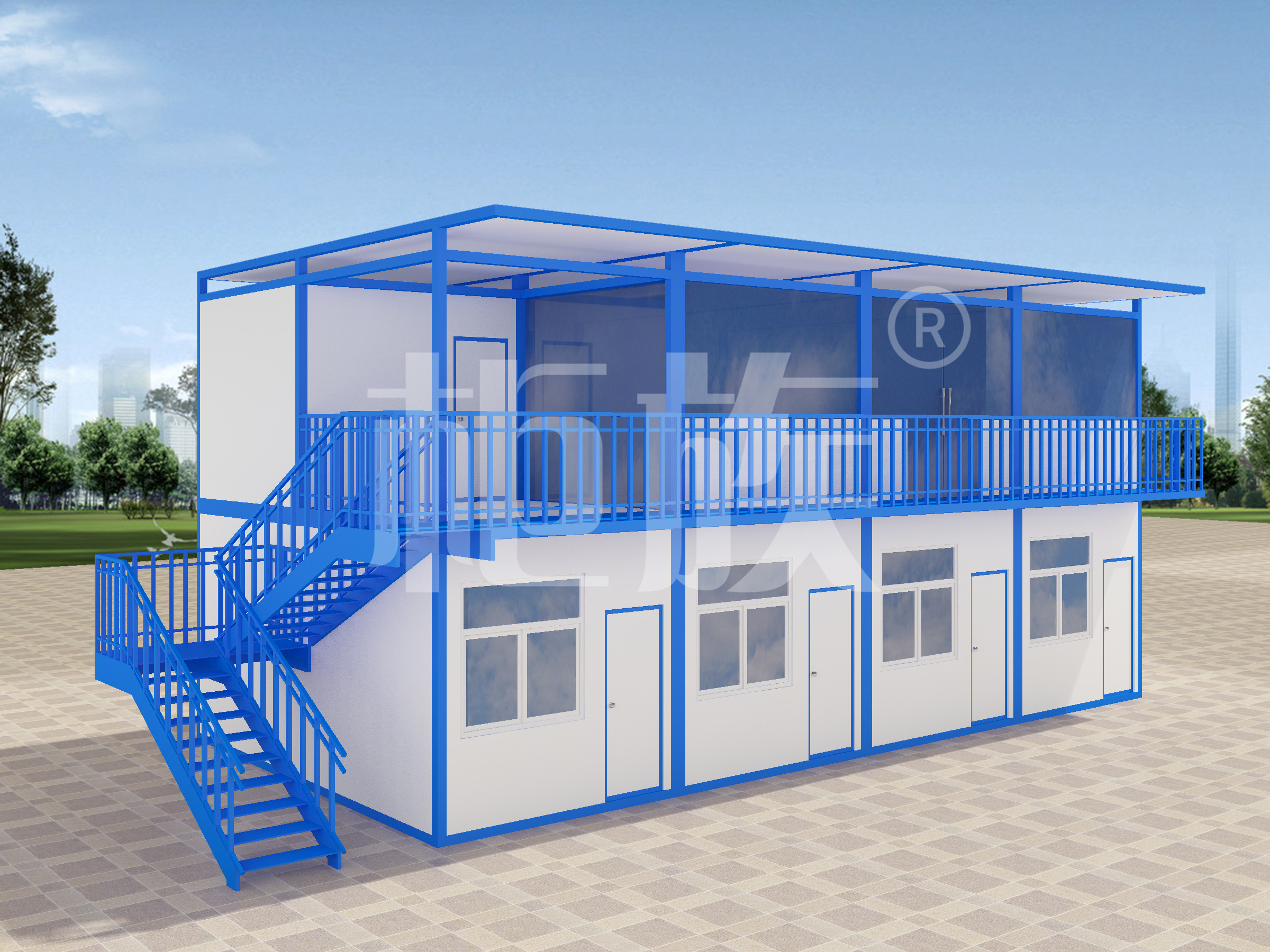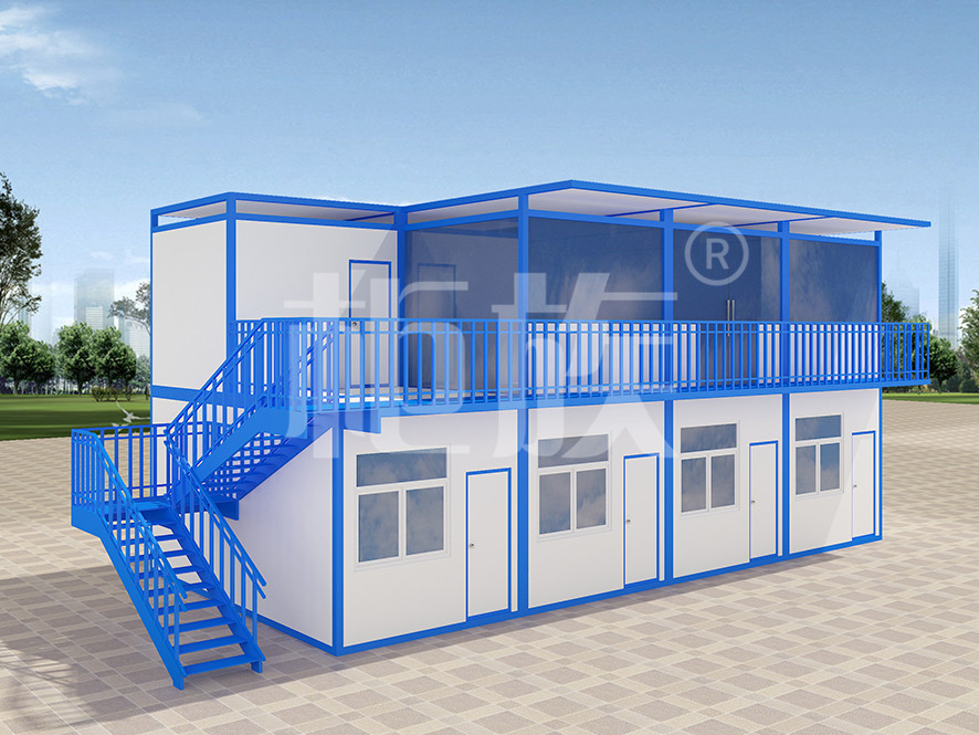 多個箱體拼接而成,藍白色的外觀簡潔流暢。工廠生產(chǎn)、成品直接運輸至使用場地,配套設施齊全,即到即用。