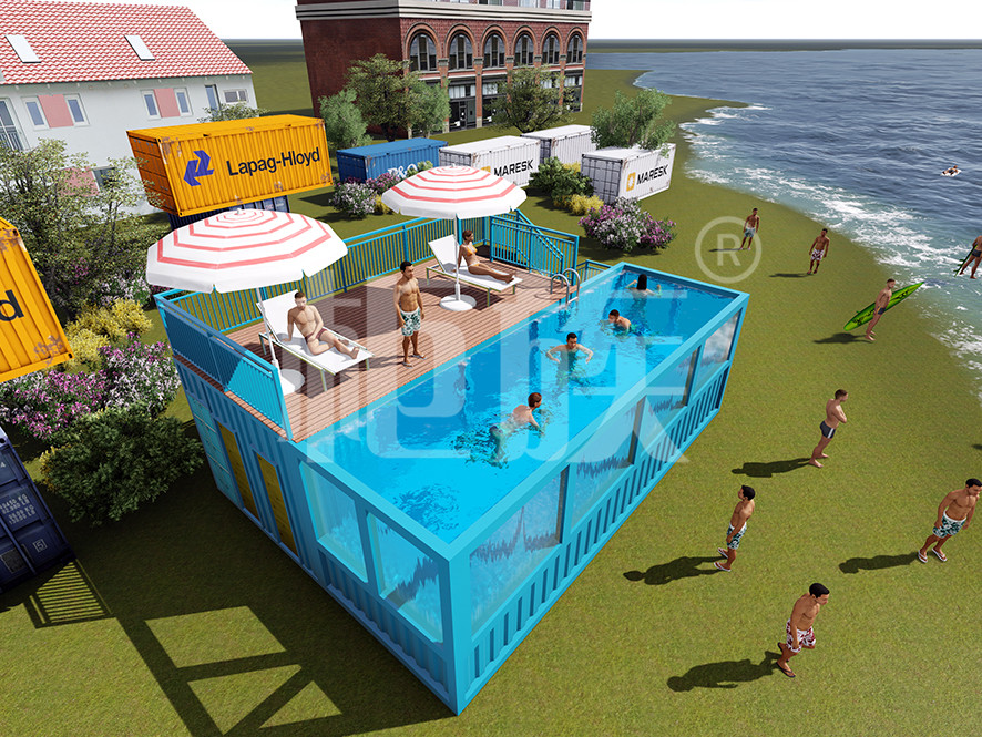 集裝箱泳池可以完全在工廠預(yù)制完成,占地小、造價(jià)低,適合庭院、海邊的度假地、以及其他公共游樂(lè)場(chǎng)所使用。