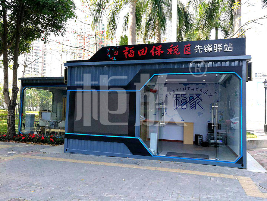驛站使用兩個集裝箱錯位串聯(lián)而成,正面墻體使用大面積玻璃門窗,線條流暢、造型時尚、通透亮堂,很好的突出了驛站的標(biāo)志性與開放性的特點。
